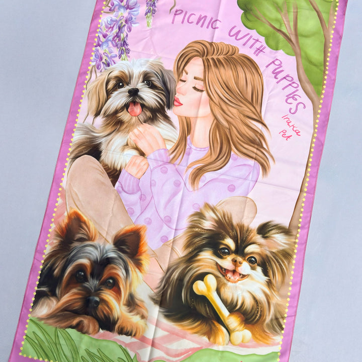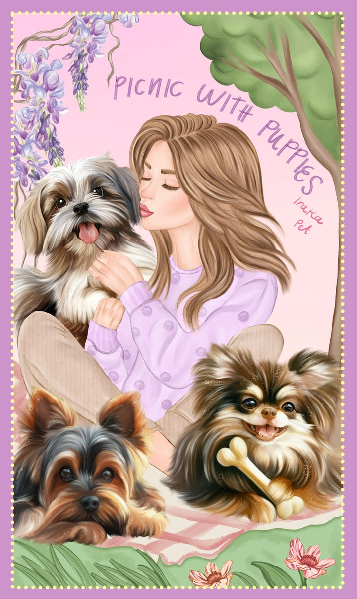 Inspirada en esos días soleados llenos de calma, flores y risas. Su ilustración retrata a una mujer disfrutando un encantador picnic en compañía de tres perritos felices. Un diseño que celebra la ternura, la conexión y la alegría de compartir los pequeños momentos con quienes más amamos.